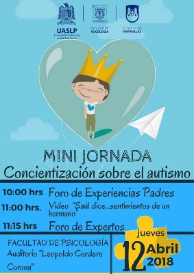 El Centro Educativo "El País de las Maravillas" de la UASLP invita a una plática testimonial con los padres de los niños que participan en su programa de tratamiento a infantes con diagnóstico del espectro del autismo, quienes compartirán las experiencias que han tenido a lo largo de este proceso junto a profesionales en el tema, el próximo 12 de abril a las 10:00 a.m. en el auditorio Leopoldo Cordero de esta Facultad de Psicología.