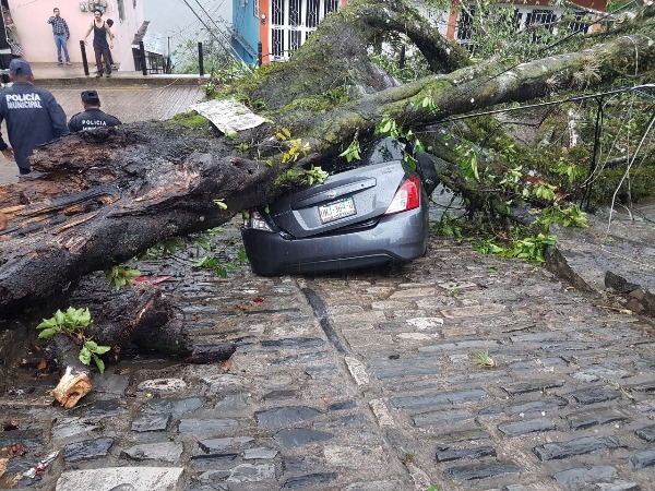 De acuerdo al reporte proporcionado por el director de Seguridad Pública Ascensión Solís de la Cruz, el primer incidente se registró durante alrededor de las 08:30 horas sobre las calles Carranza esquina 20 de Noviembre, cuando el conductor de un automóvil Sentra, marca Nissan, color gris plateado, placas de circulación UWJ-364-U descendía de la prolongada arteria y justo cuando pretendía tomar la siguiente calle sin darse cuenta un enorme árbol de "Higuerón" cayó encima del automóvil.