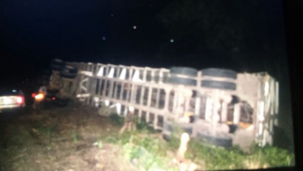 En la madrugada se registró la volcadura de un camión que transportaba varias toneladas de caña, en la carretera estatal Valles-Naranjo entre los ejidos Estación 500 y La Hincada.