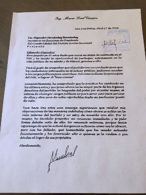 La carta de renuncia fue presentada a la dirigencia estatal del partido, a la que señala de haber fallado a los militantes, "lamentablemente he comprobado que la práctica ha cambiado en los últimos años y que priva ahora en mayor parte en los órganos directivos del partido, la búsqueda del poder, por el poder mismo, el interés de alcanzar cargos públicos no para servir sino para servirse de ellos", señala en la misiva.