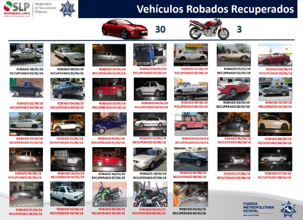 La Secretaría de Seguridad Pública del Estado (SSPE) informó que en la semana del 1 al 8 de junio se recuperaron 33 vehículos con reporte de robo, entre los que se encuentran motocicletas, unidades particulares, un tractocamión y camionetas de carga.