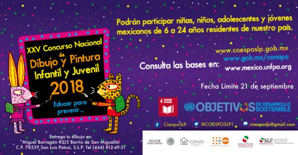 El Gobierno de la República, a través del Consejo Nacional de Población (CONAPO), en colaboración con el Fondo de Población de las Naciones Unidas (UNFPA), invitan a participar en el XXV Concurso Nacional de Dibujo y Pintura Infantil y Juvenil 2018 con el lema: "Educar para prevenir... ".