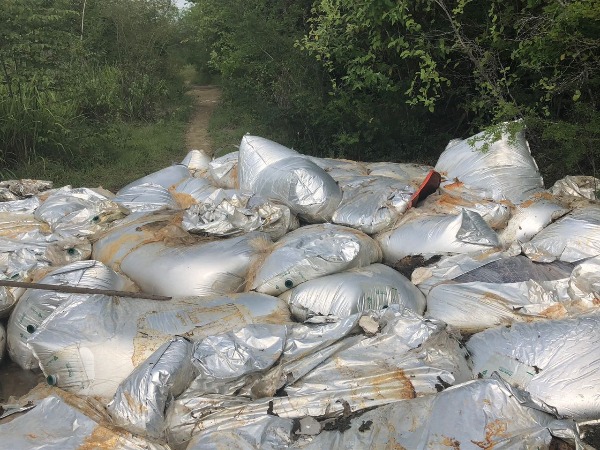 Esta mañana en un terreno enmontado ubicado en el fraccionamiento Lomas Poniente, en la parte trasera entre la NISSAN y el supermercado Soriana, accediendo por la Calle Cuarta, apareció un tiradero clandestino de costales con residuos industriales y los vecinos están inconformes.