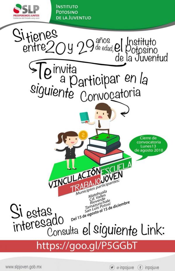 Con el propósito de fomentar la generación de capacidades y habilidades personales y profesionales, el Gobierno del Estado, a través del Instituto Potosino de la Juventud (INPOJUVE), y el Instituto Mexicano de la Juventud (IMJUVE) invitan a jóvenes a participar en el programa "Vinculación Escuela-Trabajo Joven", que ofrecerá empleo temporal en las 4 zonas del Estado.