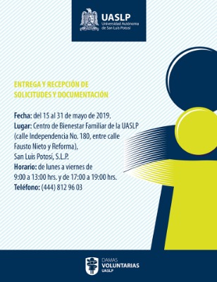 Resaltó que la convocatoria para estas becas, cierra el 31 de mayo del 2019, las y los interesados deben llevar la documentación correspondiente al Centro de Bienestar Familiar de la UASLP, que se localiza en calle Independencia no. 180, en San Luis Potosí, S.L.P, de lunes a viernes, en un horario de: 9:00 a 13:00 hrs. y de 17:00 a 19:00 hrs., o pueden comunicarse para pedir informes al número 444 812 96 03.