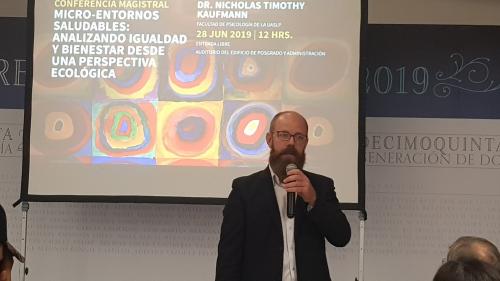 El Dr. Nicholas Timothy Kaufmann, profesor investigador de la Facultad de Psicología de la UASLP, presentó su conferencia magistral: "Micro-Entornos saludables: Analizando igualdad y bienestar desde una perspectiva ecológica", en el que destaca el papel que deberá tener la paridad de género de la ciencia en México para ser lograr ser exitosa.