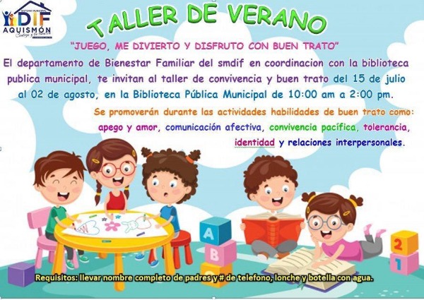 El DIF municipal de Aquismón en coordinación con la Biblioteca Municipal invitan a todos los niños del municipio a que se integren al taller de verano "Juego, me divierto y disfruto con buen trato" que empieza del 15 de julio al 2 agosto de 10 de la mañana a 2 de la tarde.