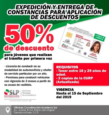 La Coordinadora del Instituto Potosino de la Juventud (Inpojuve) zona huasteca Liliana Nataly Ramírez Pérez invita a los jóvenes a aprovechar el descuento del 50% para el trámite de su licencia de conducir por primera vez que concluirá el próximo 13 de septiembre.