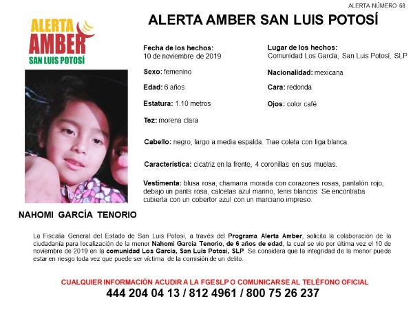 La Fiscalía General del Estado de San Luis Potosí (FGESLP) activó una Alerta Amber para apoyar a la localización de la menor Nahomi García Tenorio de 6 años de edad, quien fue vista por última vez en la comunidad Los García, perteneciente al municipio de San Luis Potosí, S.L.P.