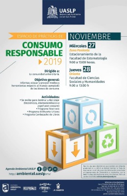 Los Espacios de Prácticas de Consumo Responsable que organiza la UASLP a través de la Agenda Ambiental, invitan a la sociedad potosina en general a participar este miércoles 27 de noviembre en el estacionamiento de la Facultad de Estomatología y el jueves 28 en la Facultad de Ciencias Sociales y Humanidades de 9:00 a 13:00 horas en lo que será el último evento del 2019.