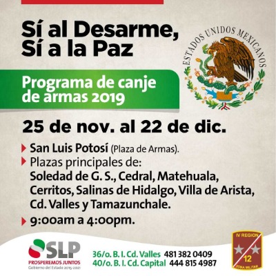 Esta acción se realiza en todo el estado para que la población no tenga que tener en su propiedad armas si así no desea, estarán además en la Plaza de Armas de la ciudad de San Luis Potosí y en los municipios de Cedral, Matehuala, Cerritos, Salinas de Hidalgo, Villa de Arista, y en la zona sur en Tamazunchale.