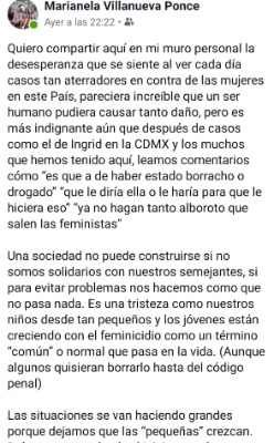 Los sucesos aterradores de feminicidios como el de Ingrid Escamilla -que fue asesinada y descuartizada por su pareja en la CDMX- fue motivo de una publicación, así como muchas más se dieron, en el perfil social de Marianela Villanueva, Directora del sistema Cobach en la entidad, quien menciona causan desesperanza el ver casos tan terribles contra seres humanos, contra las mujeres.