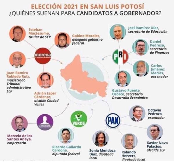 El estado de SLP sigue siendo motivo de análisis y encuestas por ser una de las entidades que en el 2021 renovará su gubernatura, y a la par las 27 diputaciones locales y 58 ayuntamientos, sin embargo, en esta ocasión Político MX, un portal de noticias de política en México se refiere en esta ocasión a quienes aspiran a dirigir la administración Potosina, en donde menciona hay un secretario de Estado involucrado, legisladores, alcaldes y funcionarios locales en la lista de quienes más suenan.
