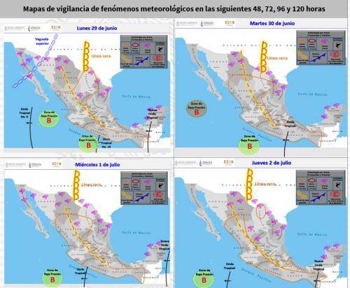 De acuerdo con los pronósticos para las próximas horas, se prevé que una línea seca se extenderá sobre el norte de Coahuila, interaccionará con la entrada de humedad proveniente el Golfo de México, ocasionando lluvias puntuales fuertes acompañadas de tormentas eléctricas, vientos fuertes y posibles granizadas en Nuevo León y Durango, así como lluvias aisladas en Tamaulipas.