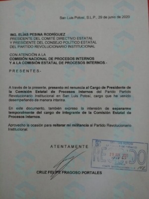 Mediante un oficio dirigido al Presidente del Comité Directivo Estatal del PRI en el estado potosino, Elias Pesina, así como al presidente del Consejo Político Estatal, con atención a las comisión Nacional y Estatal de Procesos Internos del instituto político, Cruz Felipe Fragoso Portales presentó este día su renuncia al cargo que hasta hoy ostentó como presidente de la Comisión Estatal de Procesos Internos del tricolor.