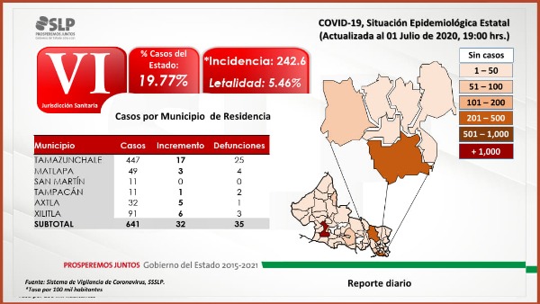 Al actualizar la situación epidemiológica que se presenta en torno al COVID 19 en la Jurisdicción Sanitaria Número 6, se informó que de los 3 mil 242 casos confirmados que hay en el estado la huasteca sur tiene 641 y de las 206 defunciones, son 35 lo que equivale al 36%.