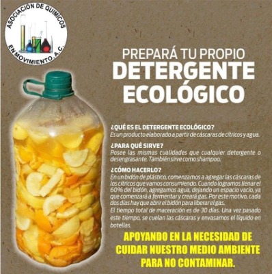 Detalló que puede prepararse en un recipiente de plástico donde se agregan las cáscaras de los cítricos que se van consumiendo en el hogar y se vierte agua, se deja fermentar por treinta días y una vez pasado este tiempo, se cuelan las cáscaras y se envasa en botellas, este detergente puede durar mucho tiempo y es una alternativa más para cuidar nuestra naturaleza, ya que con los detergentes traen químicos que van aparar a los ríos y matan la fauna.