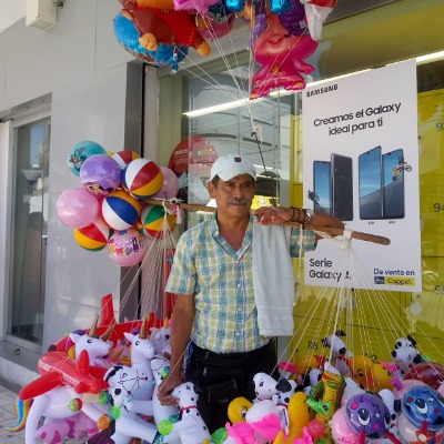 Desde hace 32 años Raymundo Medina se dedica a la venta de globos en Ciudad Valles. platica que con la pandemia ha bajado mucho la demanda ya que los niños están en sus casas y no hay quién le pida a los adultos que les compren un globo.