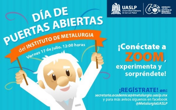 El Instituto de Metalurgia de la Universidad Autónoma de San Luis Potosí, invita a la comunidad universitaria y público en general, en especial a las niñas y los niños, para que el próximo viernes 17 de julio, a las 12:00 horas, se conecten vía la plataforma Zoom, y participen en el ya tradicional "Día de Puertas Abiertas" del Instituto.
