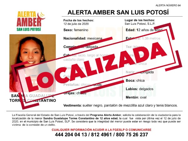 Queda desactivada la Alerta Amber emitida por la Fiscalía General del Estado de San Luis Potosí (FGESLP) para la menor Sandra Guadalupe Torres Constantino de 12 años de edad, misma que ya fue localizada sana y salva.