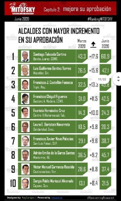 El mayor crecimiento en este rubro lo obtuvo el alcalde Benito Juárez, en la Ciudad de México, Santiago Taboada Cortina, con un aumento de 17.6 por ciento de marzo a junio.