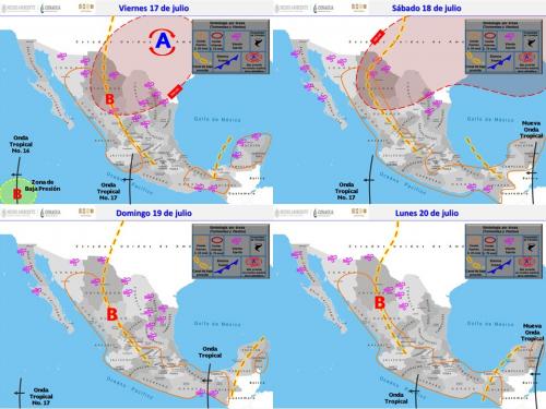 Durante el periodo de pronóstico, la onda tropical No. 17 que recorrerá el occidente del país, dos nuevas ondas tropicales que ingresarán y recorrerán el sureste, sur y occidente del territorio nacional, canales de baja presión en el interior y sureste de México e inestabilidad superior provocarán lluvias, rachas de viento, descargas eléctricas y posibles granizadas sobre los estados del noroeste, norte, noreste, occidente, centro, oriente, sur y sureste de la República Mexicana, incluido el Valle de México.