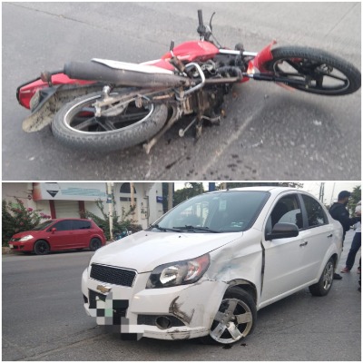 La noche de este viernes se registró un choque entre una motocicleta marca Italika color rojo, y un automóvil marca Chevrolet color blanco, en el cruce del bulevar México-Laredo y la calle Negrete de la zona centro.
