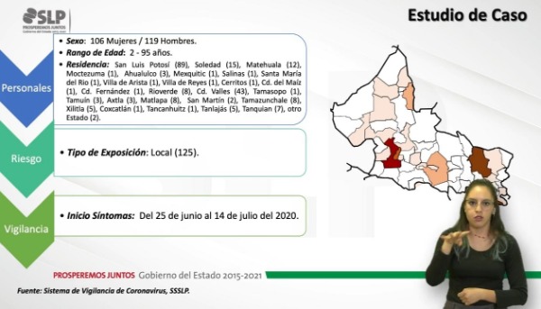 Sobre los nuevos 225 casos positivos a coronavirus, se detalló que se trata de 106 mujeres y 119 hombres, en un rango de edad de dos a 95 años; mismos que tienen como residencia 89 en la capital potosina; 15 en Soledad de Graciano Sánchez; 12 en Matehuala; uno en Moctezuma; tres en Ahualulco; uno en Mexquitic; uno en Salinas; uno en Santa María del Río; uno en Villa de Arista; uno en Villa de Reyes; uno en Cerritos; uno en Ciudad Fernández; uno en Ciudad del Maíz; ocho en Rioverde; 43 en Ciudad Valles; uno en Tamasopo; tres en Tamuín; tres en Axtla; ocho en Matlapa; dos en San Martín; ocho en Tamazunchale; cinco en Xilitla; uno en Coxcatlán; uno en Tancanhuitz; cinco en Tanlajás; siete en Tanquián de Escobedo; y dos de otro estado.