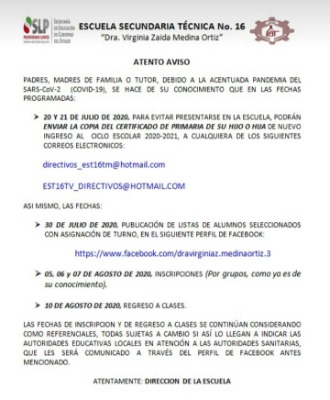 Debido a la pandemia y para evitar aglomeraciones, la escuela secundaria técnica núm. 16 de Ciudad Valles llevará a cabo las preinscripciones de nuevo ingreso virtualmente.