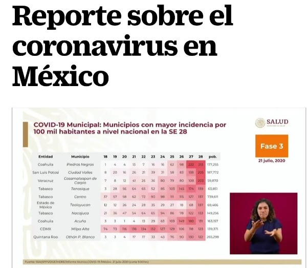 Durante la rueda de prensa Nacional de esta tarde, sobre el estatus del Covid-19 en la República Mexicana, el Subsecretario de Prevención y Promoción de la Salud, Hugo López-Gatell Ramírez, dio a conocer los municipios de todo el país con el mayor índice de contagios en las últimas horas, en donde destacó en primer lugar Piedras Negras, Coahuila y el segundo deshonroso lugar, Ciudad Valles.
