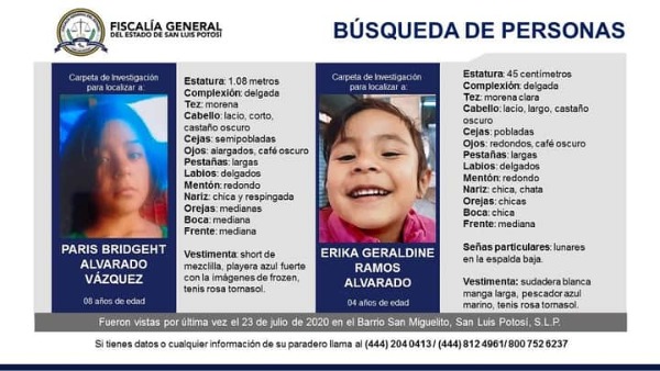 La información brindada por la dependencia, señala que las dos pequeñas, de nombres Paris Bridgeht Alvarado Vázquez, de 8 años de edad y Erika Geraldine Ramos Alvarado de 4 años de edad, fueron vistas por última vez el pasado 23 de julio en el Barrio de San Miguelito, y desde entonces se desconoce su paradero, por lo que la autoridades solicitan el apoyo de la ciudadanía para su localización y evitar que pudieran ser víctimas de algún delito.