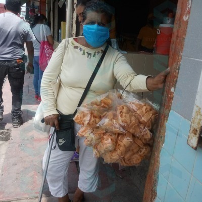 María Magdalena de 61 años, comenta que solo vende 30 bolsas de frituras al día debido a la pandemia, cuyo costo es de 5 pesos.