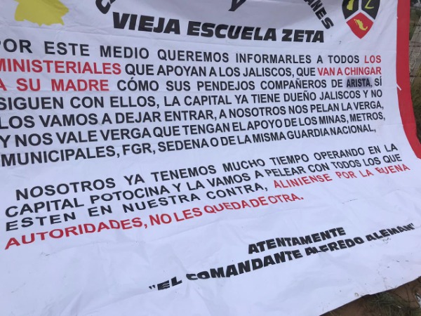 En las lonas localizadas en distintos puntos, en Soledad sobre el boulevard Río Santiago, la UPA y la carretera 57; en Moctezuma en la plaza principal y sobre la carretera que conduce a Villa de Arista, lo que ha causado temor entre la población pues prevén enfrentamientos armados por la disputa de la plaza de venta de estupefacientes.