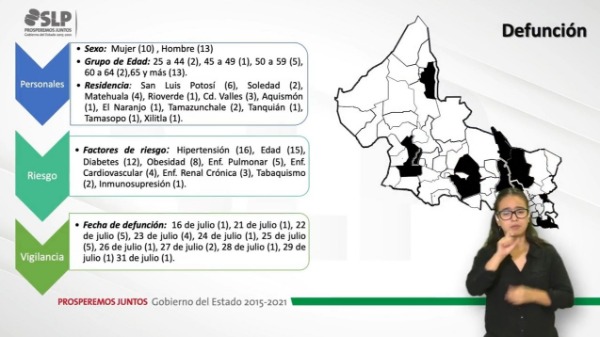 De las nuevas 20 defunciones, se dio a conocer que las víctimas corresponden a 10 mujeres y 13 hombres, con un rango de edad de 25 a 44 (2); 45 a 49 (1); 50 a 59 (5); 60 a 64 (2); 65 y más (13), quienes tenían su residencia en la capital potosina (6); Soledad (2); Matehuala (4); Rioverde (1); Ciudad Valles (3); Aquismón (1); El Naranjo (1); Tamazunchale (2); Tanquián (1); Tamasopo (1) y Xilitla (1); mismas que presentaban como antecedentes factores de riesgo de hipertensión (16); edad (15); diabetes (12); obesidad (8); enfermedad pulmonar (5); enfermedad cardiovascular (4); enfermedad renal crónica (3); tabaquismo (2); inmunosupresión (1), cuyas defunciones ocurrieron los pasados 16 de julio (1); 21 de julio (1); 22 de julio (5); 26 de julio (1); 27 de julio (2); 28 de julio (1); 29 de julio (1); y el 31 de julio (1).