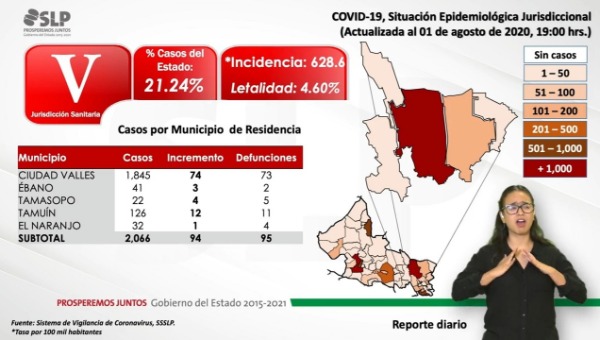 En tanto que Ciudad Valles presenta al corte de este día 74 nuevos enfermos de Covid-19, con una cifra total de mil 845 contagios; en las últimas horas se registró el fallecimiento de tres personas, para una suma total de 73 víctimas mortales.