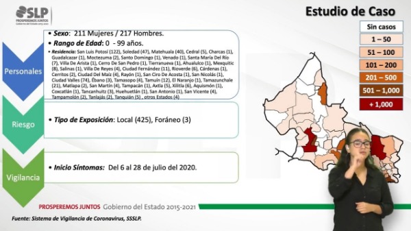 Sobre los nuevos 428 casos positivos a coronavirus, se detalló que se trata de 211 mujeres y 217 hombres, en un rango de edad de 0 a 99 años, entre los pacientes, un bebéde menos de 15 días de nacido; mismos que tienen como residencia 122 en la capital potosina; 47 en Soledad de Graciano Sánchez; 40 en Matehuala; cinco en Cedral; uno en Charcas; uno en Guadalcazar; dos en Moctezuma; uno en Santo Domingo; uno en Venado; siente en Santa María del Río; uno en Villa de Arista; uno en Cerro de San Pedro; unos en Tierra Nueva; uno en Ahualulco; ocho en Mexquitic; uno en Salinas; cuatro en Villa de Reyes; 11 en Ciudad Fernández; seis en Rioverde; uno en Cárdenas; dos en Cerritos; cuatro en Ciudad del Maíz; uno en Rayón; uno en San Ciro de Acosta; uno en San Nicolás Tolentino; 74 en Ciudad Valles; tres en Ébano; cuatro en Tamasopo; 12 en Tamuín; uno en El Naranjo; 21 en Tamazunchale; dos en Matlapa; cuatro en San Martín Chalchicuautla; uno en Tampacán; cinco en Axtla de Terrazas; seis en Xilitla; uno en Aquismón; uno en Coxcatlán; tres en Tancanhuitz; uno en Huehuetlán; uno en San Antonio; cuatro en San Vicente; dos en Tampamolón Corona; dos en Tanlajás; cinco en Tanquián de Escobedo; y cuatro de otros estados.