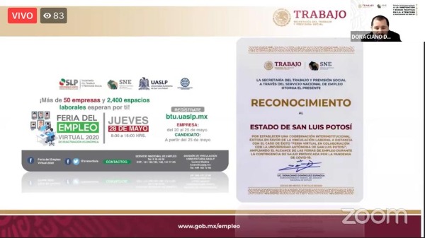 Cabe hacer mención que la feria virtual de empleo, reconocida como una práctica innovadora se desarrolló a finales del mes de mayo con la participación de más de 2 mil 400 buscadores de empleo y por lo menos 80 empresas, en coordinación con la Universidad Autónoma de San Luis Potosí con quien ya se trabaja para una segunda edición.