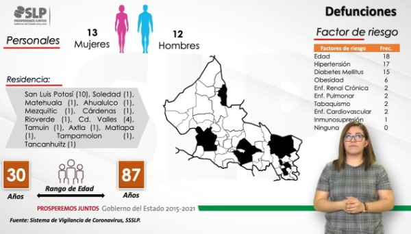 De las nuevas 25 defunciones, se dio a conocer que las víctimas corresponden a 13 mujeres y 12 hombres, con un rango de edad de 30 a 87 años; con residencia en la capital (1); Soledad (1); Matehuala (1); Ahualulco (1); Mexquitic (1); Cárdenas (1); Rioverde (1); Ciudad Valles (1); Tamuín (1); Axtla (1); Matlapa (1); Tampamolón (1) y Tancanhuitz (1); mismas que presentaban como antecedentes factores de riesgo de edad (18); hipertensión (17); diabetes mellitus (15); obesidad (6); enfermedad renal crónica (2); enfermedad pulmonar (2); tabaquismo (2); enfermedad cardiovascular (2); inmunosupresión (1).