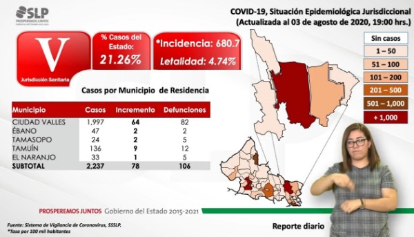 Asimismo, Ciudad Valles presenta al corte de este día 64 nuevos contagios, para in total de mil 997 pacientes y un total de 82 víctimas mortales, cuatro de ellas fallecieron en las últimas horas.