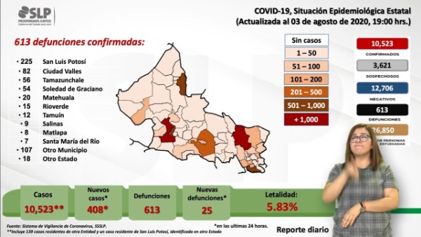 Sobre los nuevos 408 casos positivos a coronavirus, se detalló que se trata de 205 mujeres y 203 hombres, en un rango de edad de 0 a 98 años; mismos que tienen como residencia 165 en la capital potosina; 33 en Soledad de Graciano Sánchez; 21 en Matehuala; uno en Guadalcazar; uno en Santa María del Río; cinco en Villa de Arista; uno en Ahualulco; uno en Mexquitic; uno en Salinas; uno en Villa de Arriaga; uno en Villa de Reyes; 11 en Ciudad Fernández; 16 en Rioverde; uno en Alaquines; dos en Cárdenas; uno en Ciudad del Maíz; uno en Rayón; 64 en Ciudad Valles; dos en Ébano; dos en Tamasopo; nueve en Tamuín; uno en El Naranjo; 28 en Tamazunchale; tres en Matlapa; tres en San Martín Chalchicuautla; seis en Axtla de Terrazas; siete en Xilitla; cuatro en Aquismón; uno en Coxcatlán; ocho en Tancanhuitz; dos en Huehuetlán; uno en San Vicente Tancuayalab; uno en Tampamolón; uno en Tanquián; y tres de otro Estado.