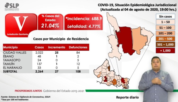 Ciudad Valles presenta al corte de este día 25 nuevos pacientes y dos muertes más, para una cifra total de 2 mil 022 casos y 84 víctimas mortales en lo que va de la pandemia.