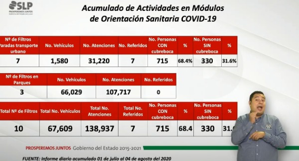 Refiere que del informe diario acumulado del 1 de julio al 4 de agosto del presente año, a través de los siete filtros el transporte urbano se atendieron a 31 mil 220 personas a bordeo de 15 mil 80 unidades de los cuales 715 portaban cubrebocas.
