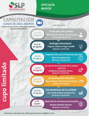Como parte de su programa anual de capacitación, la Oficialía Mayor de Gobierno del Estado, a través de la Dirección de Desarrollo Humano, tiene programada la realización de siete cursos virtuales durante agosto, por lo que extiende la invitación a las y los servidores públicos para que se inscriban y participen en esta oportunidad de instruirse sin salir de casa durante el periodo de contingencia sanitaria.