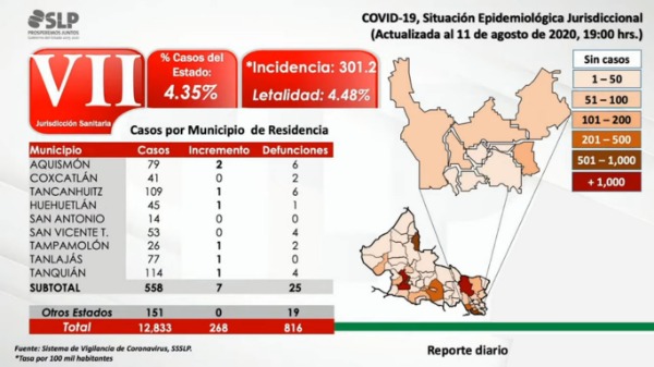 7 casos nuevo de Coronavirus se registró en la Jurisdicción Sanitaria Número 7 con sede en Tancanhuitz en las últimas 24 horas, dando un total de 558, informó el jefe de la jurisdicción Jonás Terán Secundino.