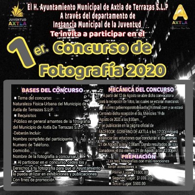 Se llevará a cabo el Primer Concurso de Fotografía en Axtla de Terrazas, mismo que se encuentra organizando la Instancia Municipal de la Juventud y será el día 21 de agosto a las 12 horas del día cuando se de a conocer a los ganadores.