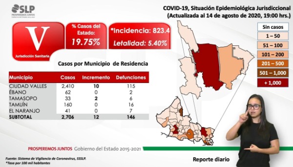 Ciudad Valles presenta al corte de este día un incremento de 10 nuevos contagios, con un número tota de enfermos de 2 mil 410 contagios, y total de pacientes y 115 víctimas mortales, una de ellas falleció en las últimas horas.