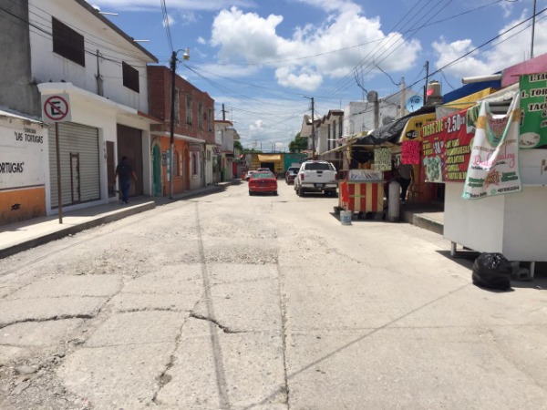El mal estado de la calle Niños Héroes, en el centro de Ciudad Valles, no solamente ha provocado daños a los vehículos que por allí transitan, sino también en puestos de comida que se ubican en un costado de la arteria.