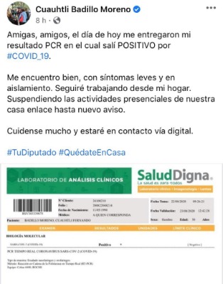 En su publicación, el legislador añadió una imagen de los resultados positivos de las pruebas de laboratorio PCR Tiempo real coronavirus SARS-COV-2 (Covid-19)