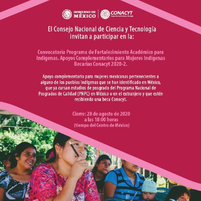 En el marco del Programa de Fortalecimiento Académico para Indígenas que coordina el Consejo Nacional de Ciencia y Tecnología, se extiende la invitación para participar en la convocatoria del Programa de Fortalecimiento Académico para Indígenas, Apoyos Complementarios para Becarias del CONACYT 2020-2.