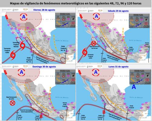Para hoy viernes, se pronostica que el centro de la Tormenta Tropical Hernan ingrese a tierra por la región sur de Baja California Sur (inmediaciones de La Paz, B.C.S.), favorecerá lluvias puntuales torrenciales en Baja California Sur, Sinaloa, Nayarit y Jalisco. Además, se prevén rachas de viento superiores a los 70 km/h y olas de 3 a 5 metros de altura significante en zonas de Baja California Sur (sur), así como rachas superiores a 60 km/h y oleaje de 2 a 4 metros de altura significante en las costas de Sinaloa, Nayarit y Jalisco.
